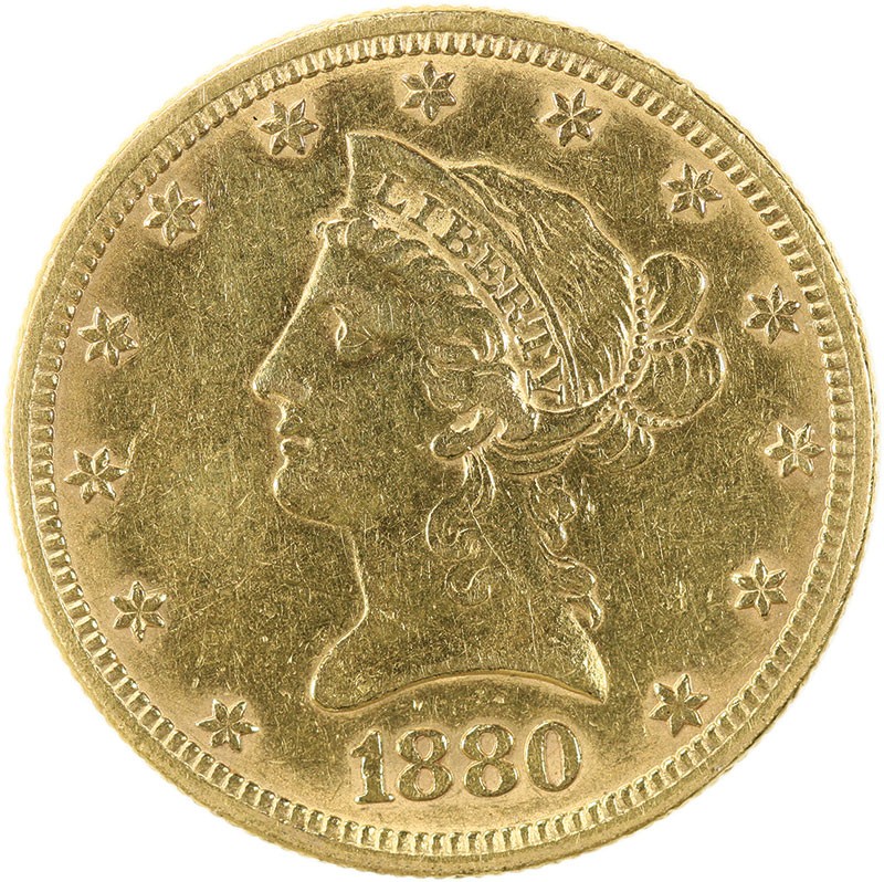 1880 $10 Liberty. Detail of EF. A polished ex-jewelry coin that has sustained a scattering of other light marks and scratches.