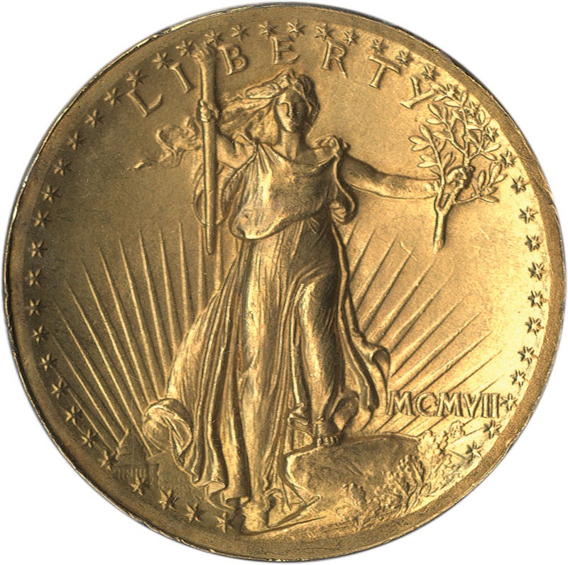 MCMVII (1907) $20 Saint Gaudens.High Relief, Wire Edge. PCGS MS64. There is a warm, velvet-like glow beneath an ever so subtle blush of wholly original orange-golden toning. The fields are generally quite smooth, and the limited number of small marks and imperfections that this lovely coin does possess are nearly all confined to inconspicuous locations along the rim. Considered to be one of the most beautiful coins ever to be struck by the U.S. Mint, This magnificent High Relief design has long been a favorite amongst collectors. Moreover, the scarcity and importance of this low mintage (only 12,367 pieces were struck) one year type coin forever solidifies its level of demand.