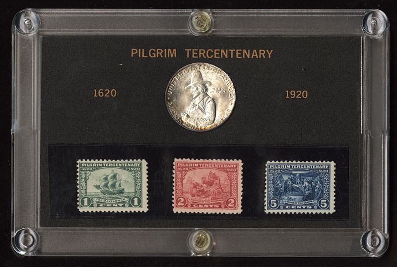 1920 Pilgrim Tercentenary. Brilliant Uncirculated or better. The peripheries are nicely accented by areas of russet-mauve and iridescent toning. Housed in a custom display holder along with an example of the 1c, 2c, and 5c Pilgrim Tercentenary stamps.