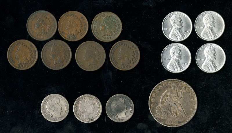 U.S. Type Coins. Indian Cents (7), Good or better, some with problems; Zinc Cents (4) BU; Barber Dimes (3) , Good; 1876 Half Dollar Choice VF. [15]