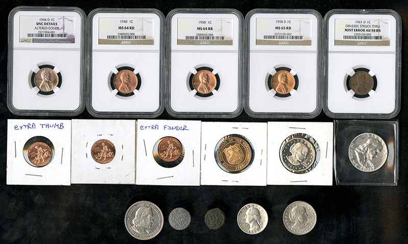 Miscellaneous group of U.S. Coins: 1944-D NGC "Unc Details" altered color; 1948 1 Cent NGC MS65RD, bright color; 1958 1 Cent NGC MS64RD; 1958-D 1 Cent NGC MS65RD; 1961-D NGC AU58BN, obverse struck through mint error. Second "1" in date is missing; 1932-D Quarter VG, cleaned; 1892 Columbian Half, EF, cleaned; 1957 Half Brilliant proof; 1979-P SBA $1 BU; 1981-S SBA $1, Brilliant proof; 2 miscellaneous U.S. and foreign coin replicas. [16]