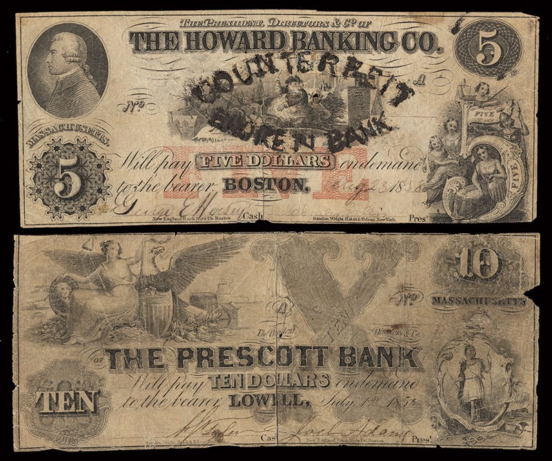 MA. Rare Duo. 1) Boston. $5. Howard Banking Co. $5. 1858. (C8a) Santa Claus. Fine detail, "COUNTERFEIT / BROKEN BANK" above and below the central vignette. Minor stains and a small chip out of the bottom border. 2) Lowell. $5. Prescott Bank. 1851. (G12) VG details, pin holes, mounting remnants.