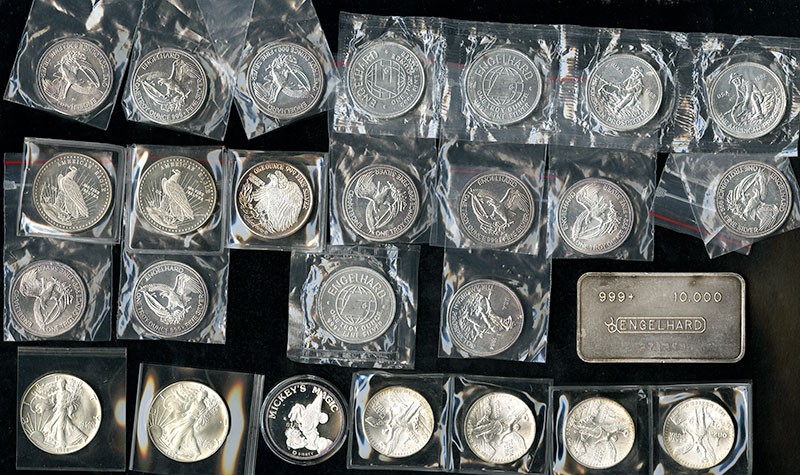 Assorted Silver Rounds and Bars. Englehard one ounce Prospector silver rounds (15); Mexico silver one Onzas (4); Mixed .999 silver rounds (3); American Silver Eagles (2); 10 Ounce Engle Hard .999 pure silver ba.; 1 ounce Mickey Mouse 1987 Silver round with certificate and original box. Sold as is. [26]