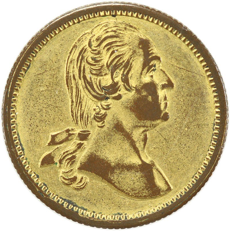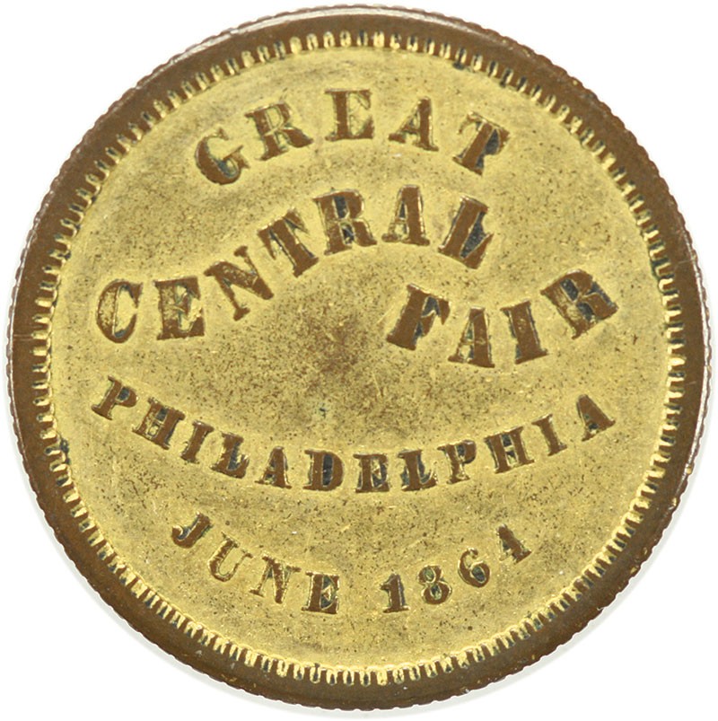 Great Central Fair Medallet. Philadelphia, June 1861. Baker-363B, Gilt Copper. Listed by Rulau-Fuld as Rarity-8 (5-9 known). Choice Extremely Fine or better. The underlying copper is visible at the rims and highpoints of the legends and design elements, otherwise the gilt surface is largely intact. A rare variant of this recognizable design.