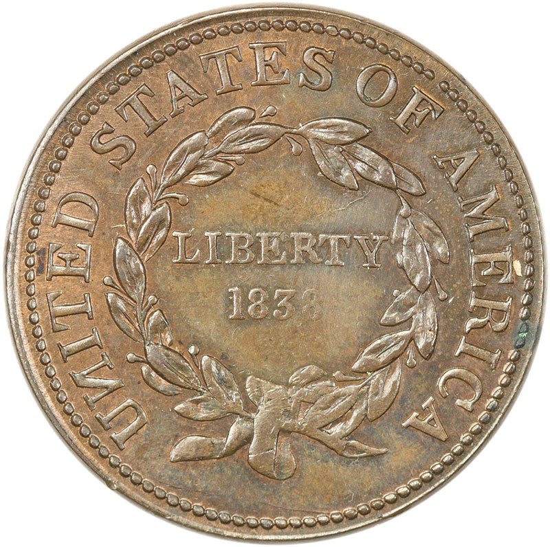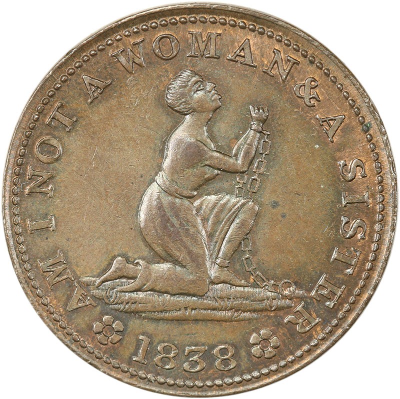 1838. Am I Not A Woman. Hard Times Token. Low 54, HT 81. Choice AU. Kneeling slavewoman in chains. Tiny earthen deposit reverse periphery, soft brown tone with attractive bands of orange.