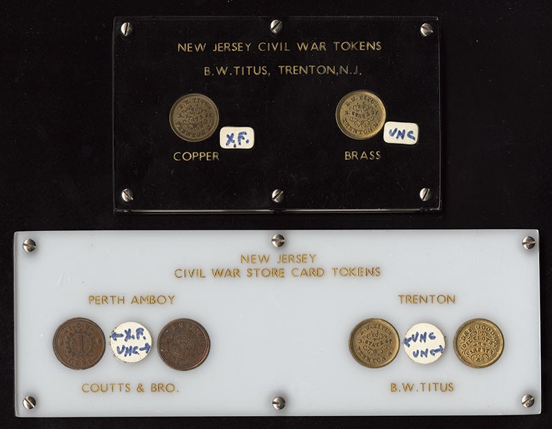 New Jersey Civil War Merchant Tokens (6): B.W. Titus, Trenton. Examples in Copper and Brass. In a custom lucite holder. Extremely Fine and Uncirculated; B.W. Titus, Trenton. Brass; and Coutts & Bro., Perth Amboy. Extremely Fine and Uncirculated examples of each. In custom lucite holder. (6)