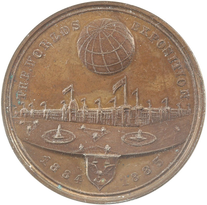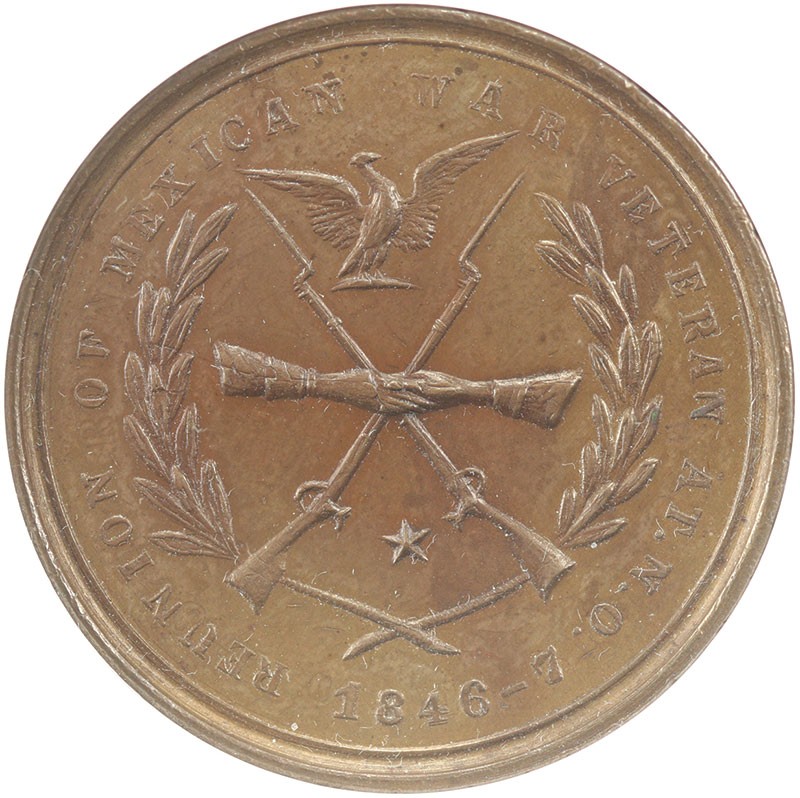So-Called Dollar. World's Industrial & Cotton Exposition, New Orleans 1884-1885. HK-unlisted. NGC MS 64 BN. World globe over fairgrounds as HK-143; reverse: within a wreath, arms with their hands clasped over crossed rifles with fixed bayonets, eagle above; REUNION OF MEXICAN WAR VETERAN AT N.O. 1846-7. Very Rare.