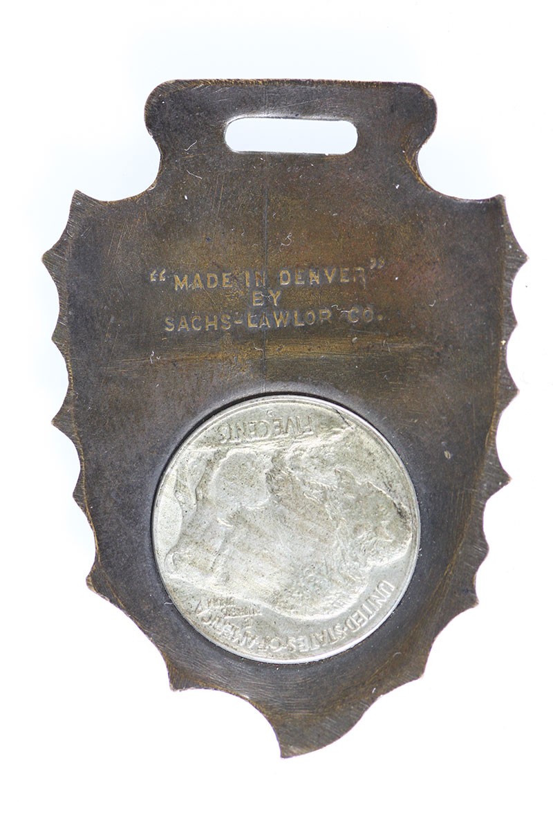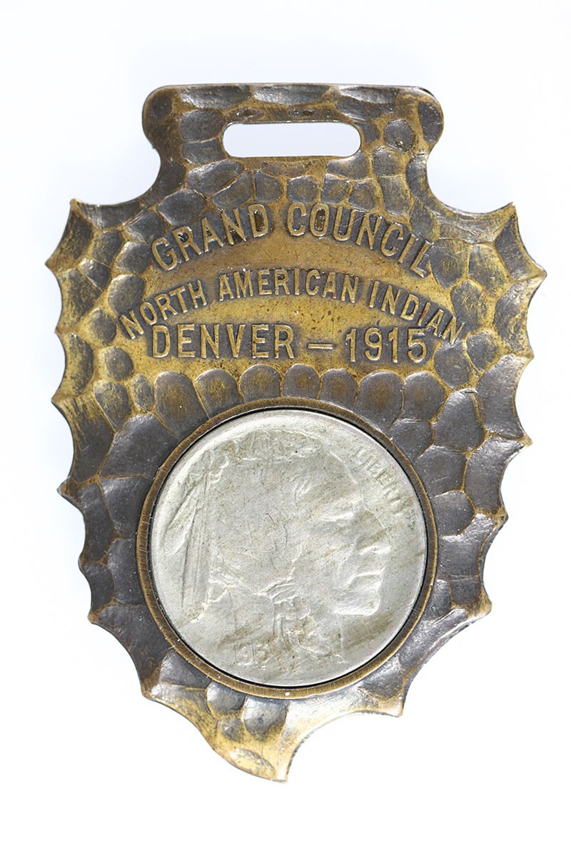 Grand Council - North American Indian, Denver 1915. Souvenir Arrowhead Encased 1913 `D' Buffalo Nickel. Bronze arrowhead-shaped encasement with slit on top for suspension. '"Made in Denver" By Sachs-Lawlor Co.' on back. The Council was given in conjunction with the Panama-Pacific Expo. The nickel grades Extremely Fine-AU, an interesting piece.