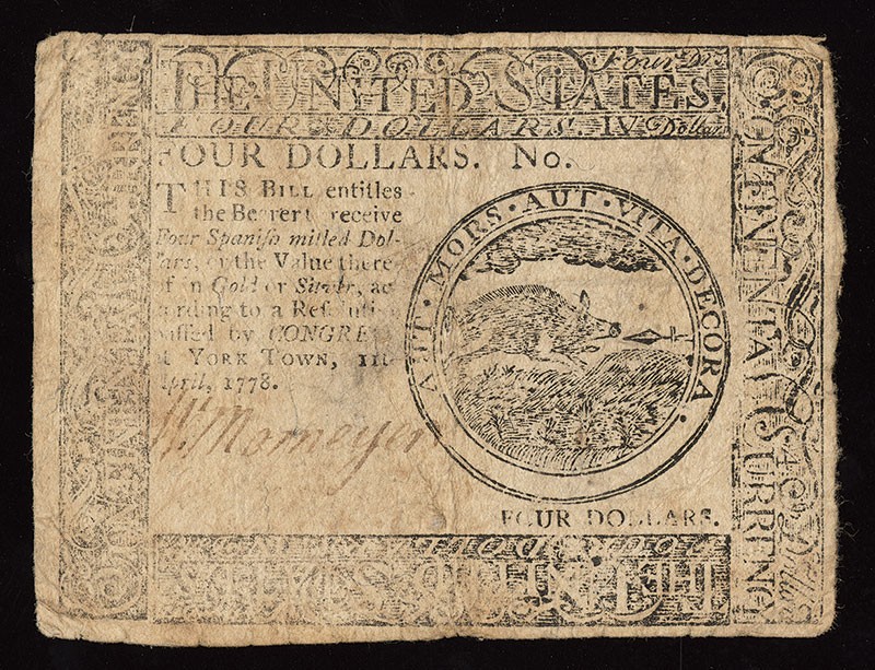 Continental Currency. April 11, 1778. $4. (CC-78) Yorktown. Boar and spear. The most elusive of the eleven Continental issues. A nice example, with generous margins. F-VF.