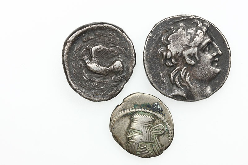 Trio of Ancient Greek Silver Coins: Sikyon. Stater, struck ca. 431-400 BC. 10.85 gms. Chimaera left/Dove left within wreath. SNG Copenhagen 31. Toned over surface corrosion, Fine; Seleukid. Antiochos VII Euergetes (138-129 BC). Tetradrachm. Antioch. 16.39 gms. Head right/Athena Nikephoros, left, monogram before, within wreath. SMA 283. Deep gray, pinscratches, About Very Fine; and Parthian Drachm. Light deposit, About Very Fine. (3)