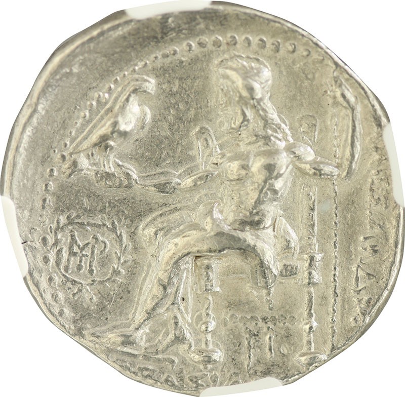 Seleukid Kingdom of Syria. Seleukos I Nikator (312-281 BC). AR Tetradrachm. "Babylon", ca. 311-300 BC. Struck in the name of Alexander the Great. Herakles head right wearing lion's skin headdress, rev. Herakles enthroned left holding eagle and scepter, monogram in wreath before, H below throne. Price 3704. NGC XF.