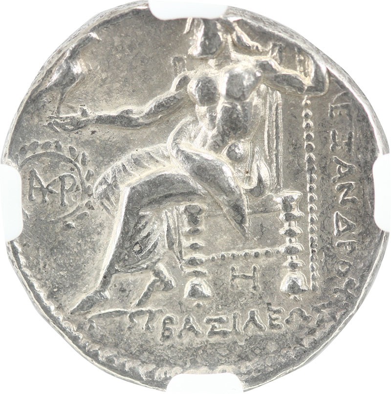 Seleukid Kingdom of Syria. Seleukos I Nikator (312-281 BC). AR Tetradrachm. "Babylon", ca. 311-300 BC. Struck in the name of Alexander the Great. Herakles head right wearing lion's skin headdress, rev. Herakles enthroned left holding eagle and scepter, monogram in wreath before, H below throne. Price 3704. Slightly tight flan loses top of Zeus' head. NGC Ch XF.
