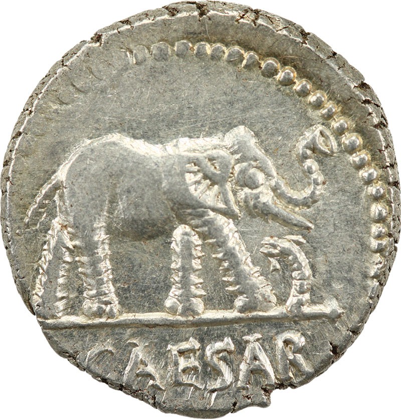 Julius Caesar. Denarius, April-August 49 BC. Military mint traveling with Caesar. 3.99 gms. Elephant striding right, flaring trunk and trampling horned serpent, rev. Priestly emblems - simpulum, aspergillum, securis, and apex. Craw.443/1, Syd.1006. Lightly toned, Extremely Fine.