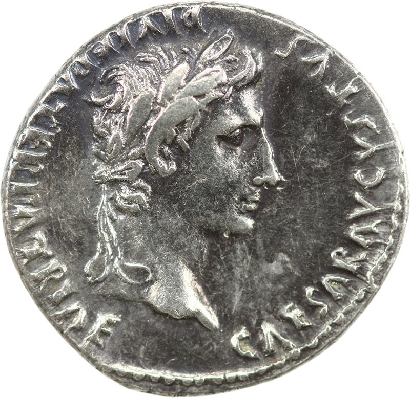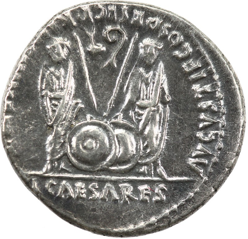 Augustus (27 BC-14 AD). Denarius, ca. 2 BC-12 AD. Lugdunum. 3.88 gms. Laureate head of Augustus right, rev. Caius and Lucius Caesars standing facing, holding shields and spears between them, simpulum and lituus above. RIC 207. Pleasing metal quality, toned, Good Very Fine.