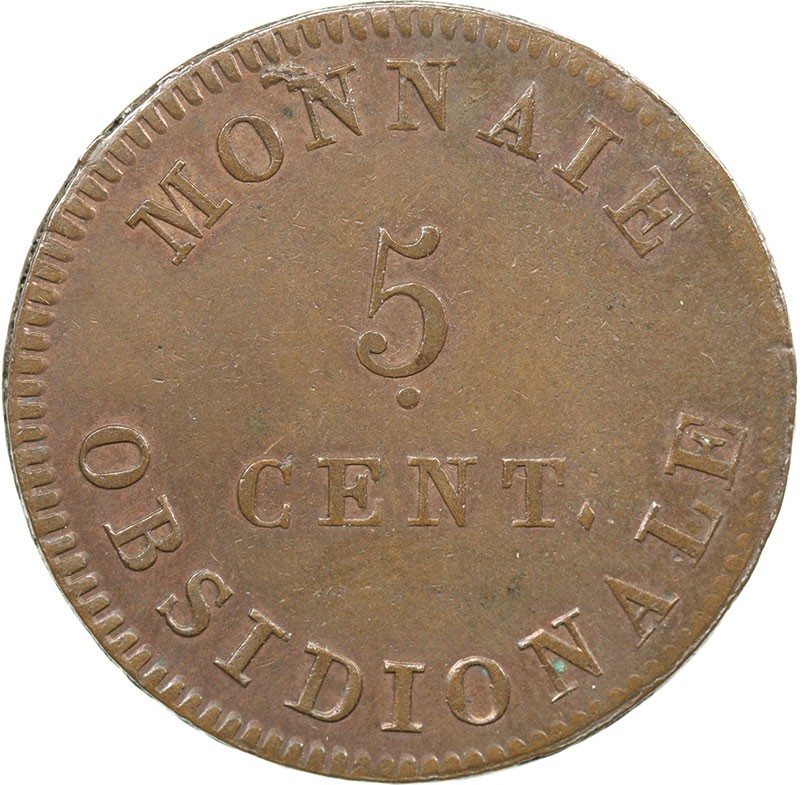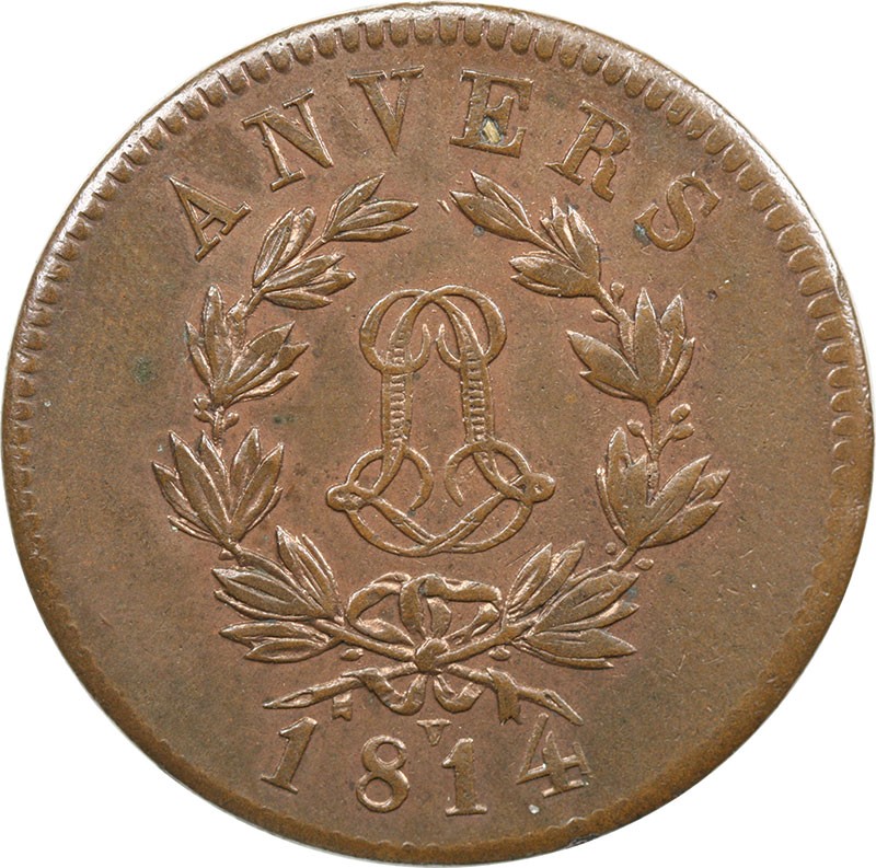 Belgium. Antwerp. Siege Coinage. Louis XVIII of France. 5 Centimes, 1814. Monogram double L within wreath, 'V' below, rev. Value. Struck by the French from captured cannons. KM 3.2. Some original lustre and orange-red. Choice Extremely Fine-AU.