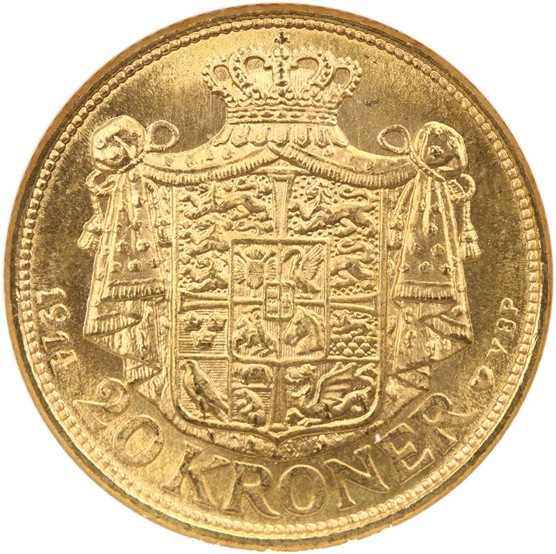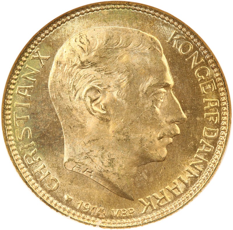 Denmark. Christian X (1912-1947). 20 Kroner, 1914 AH/GJ. NGC MS65. Wonderfully fresh, and encapsulated in an early "fat" NGC holder.