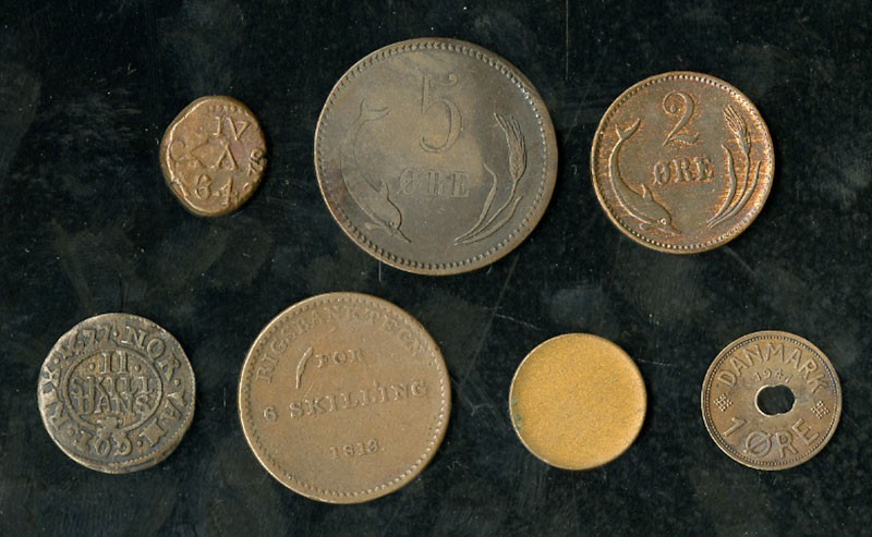 Denmark and Colonies. Small lot of Error Coins -- Double-struck 1891 5 Øre; 1899/7 2 Øre; 1 Øre blank planchet; 6 Skilling,1813. Excess metal cud; 2 Skilling, 1677. Off-center (about 15%;); Faeroe Islands. 1 Øre, 1941. Double-punched center hole; Tranquebar. IV Kas, 1842. Double-struck. Fine-Extremely Fine. [7]