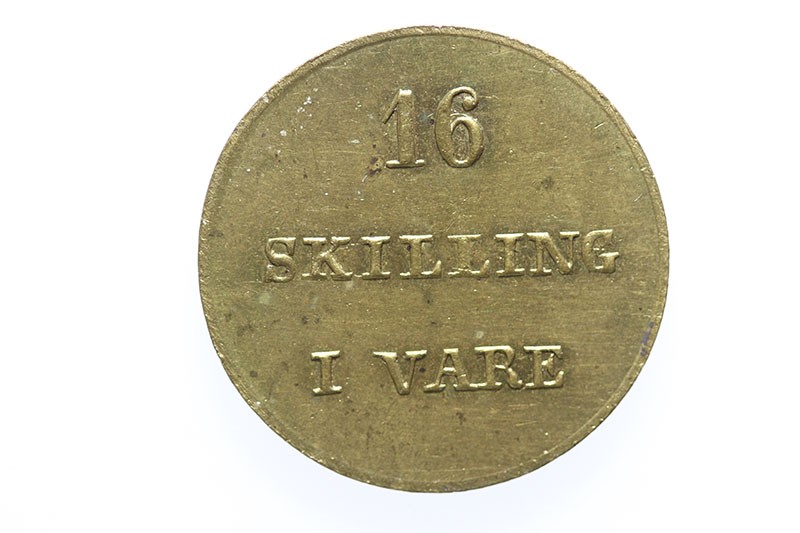 Færøe Islands. C.F. Siemsen. 16 Skilling I Vare Token (1846). Merchant's initials, rev. Value. Sieg 6, KM Tn8. C.F. Siemsen, a German merchant, operated stores in the Færøe Islands and Reykjavik, Iceland; and these tokens were used at both locations. Since few Danish or other Scandinavian coins found their way to the Færøes or Iceland, merchants were forced to issue their own private money. Token issues began in the mid-19th Century. In Iceland, some issuers, though, posted inflated prices alongside legal circulating coins. The backlash resulted in the 1901 ban on the production and usage of tokens in Iceland. Very scarce. Some lustre, About Uncirculated.