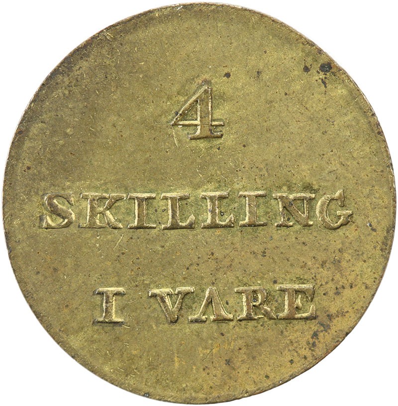 Færøe Islands. C.F. Siemsen. 4 Skilling I Vare Token (1846). Merchant's initials, rev. Value. Sieg 6, KM Tn8. Rare. Some lustre, Extremely Fine-About Uncirculated.