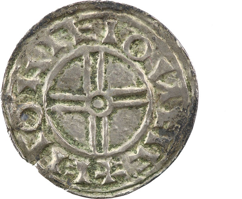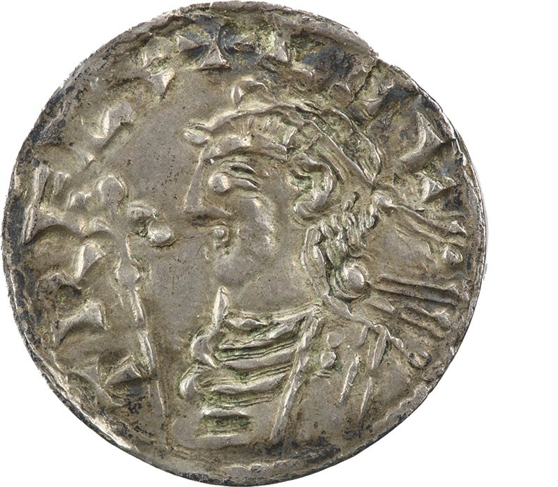 England. Late Anglo-Saxon. Cnut (1016-1035). Short Cross Penny. Chicester, uncertain moneyer. O.84 gms. Diademed bust left holding lis-topped scepter; +CNV-T RECX, rev. Short cross voided, pellet in circle at center; AEIIONIc ION(the `N' reversed) CIC. N.790, S.1159. Old cabinet toning, Good Very Fine.