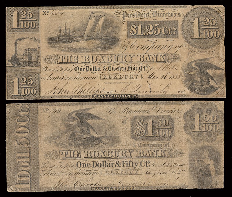 MA. Roxbury Bank Pairing. 1) $1.25. 1838. (G6) About Fine, tear. 2) $1.50. 1837. (8) VG, trimmed close. [2]