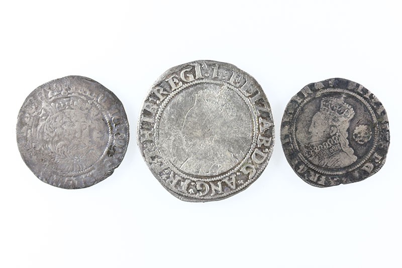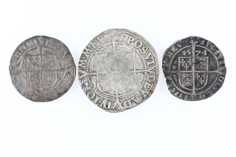 England. House of Tudor. Trio of coins. Henry VIII (1509-1547). Groat. Bristol. S. 2373. Some tooling on bust, About Fine; Elizabeth I (1558-1603). Shilling, (160)1. (mm. `1'); Six Pence, 1574. S.2584, 2563. The first with a few old pinscratches, the latter some crimping, Very Good-Fine. (3)