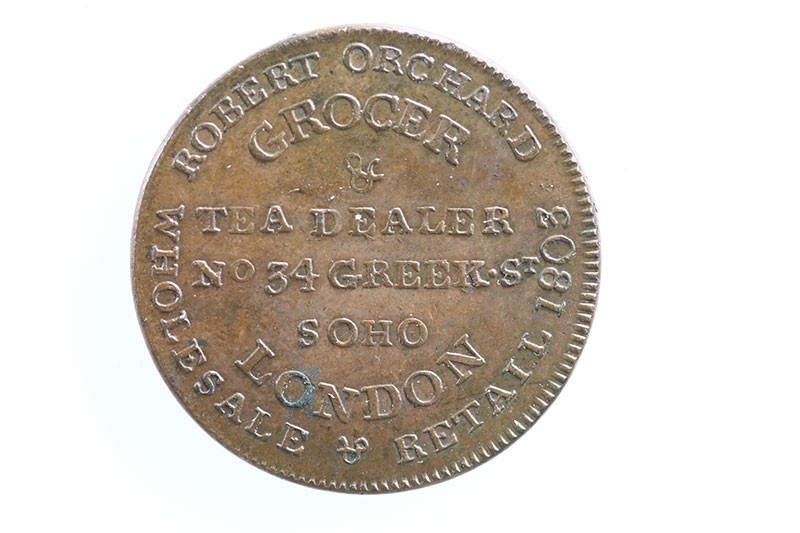 Great Britain. England. Middlesex. Robert Orchard, grocer and tea dealer. Farthing Token, 1803. Orchard address, rev. Turk standing among bales. D&H 1061. Uncirculated.