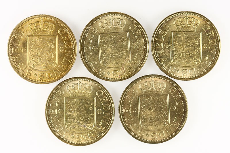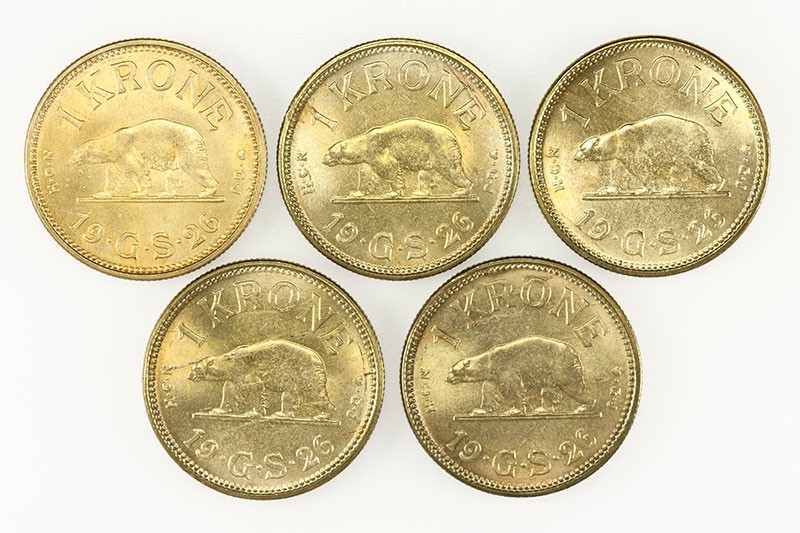 Greenland. Danish Colony. Quintet of Krones, 1926. Polar bear striding left. Sieg 4.1, KM 8. Choice Brilliant Uncirculated. (5)