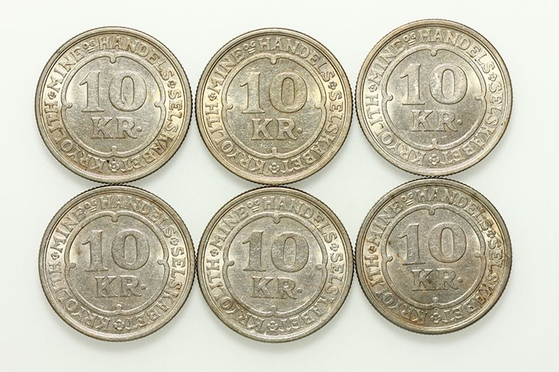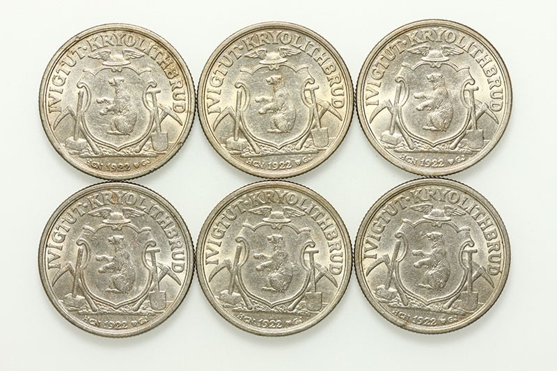 Greenland. Ivigtut Cryolite Mining and Trading Co. Fourth Token series. Sextet of 10 Kroner, 1922 (struck 1926). Copper-nickel. Company Arms - polar bear seated left on a shield topped by a winged petasos, rev. value. S.27, KM Tn49. Extremely Fine-About Uncirculated. (6)