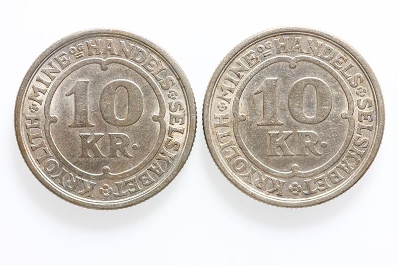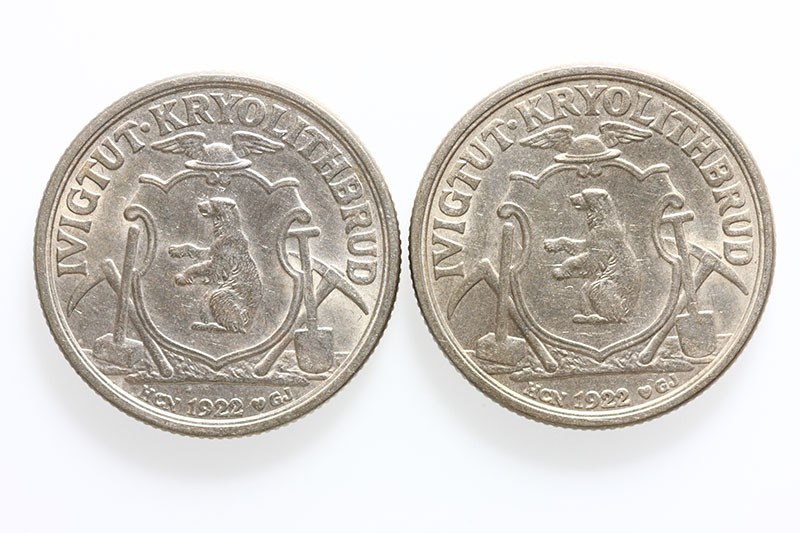 Greenland. Ivigtut Cryolite Mining and Trading Co. Fourth Token series. Another Study Pair of 10 Kroner, 1922. Regular (clean die) type and "snowball" variety. S.27, KM Tn49 and var. Extremely Fine-About Uncirculated. (2)