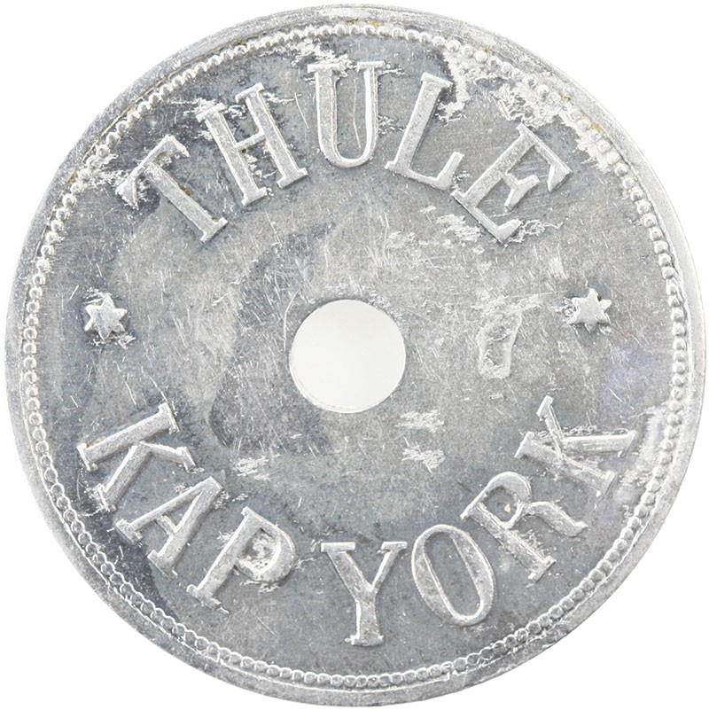 Greenland. Thule - Kap York. 10 Kroner Token, 1932. Aluminum. Rare with a mintage of only 500 pieces. Sieg 36, KM Tn10. Set on the Hayes Peninsula in northwestern Greenland, the Thule (Gaanaaq) - Kap York Arctic Trading station was established in 1910 by Polar explorer Knud Rasmussen and his associate Peter Freuchen, who served as the trading station's first manager until 1920. Rasmussen named the village which sprung up around the Kap York trading station, Thule. The United States currently maintains an airbase there. At 750 miles north of the Arctic Circle, it is the USAF's northernmost base. Faint pesting as typical, Extremely Fine.