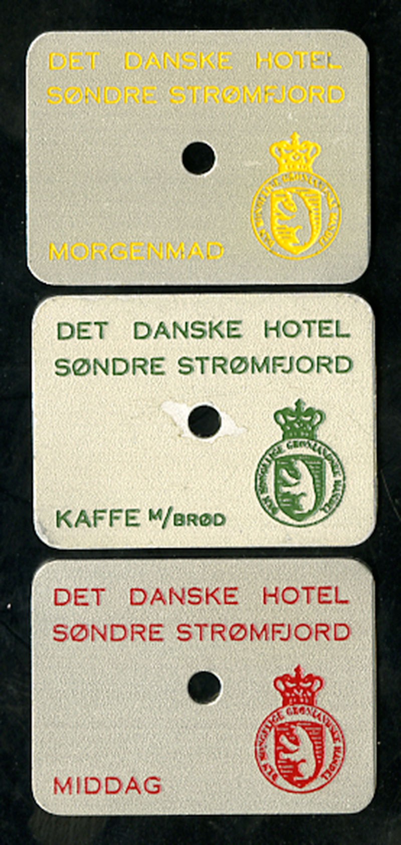 Greenland. Royal Greenland Trading Co. (KGH). Danske Hotel. Søndre Strømfjord. Food Tokens, ca. 1960's. Aluminum, rectangular. Uniface. Morgenmad (Breakfast), Middag (Early Dinner) and Kaffe m.brod (Coffee with bread). Sieg p.368. These interesting, metallic food chits were issued in two sets: one for the canteen at Narssarssuaq, the other for the Danske Hotel in Søndre Strømfjord. They were used until the early 1980's by airline passengers making transit connections in Narssarssuaq and Søndre Strømfjord (Greenland's entry point for all regular flights). (For related plastic and cardboard Spisebilleter [food tickets], see lot 367). The last with minor contact marks, Extremely Fine-AU. (3)