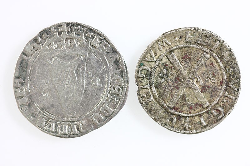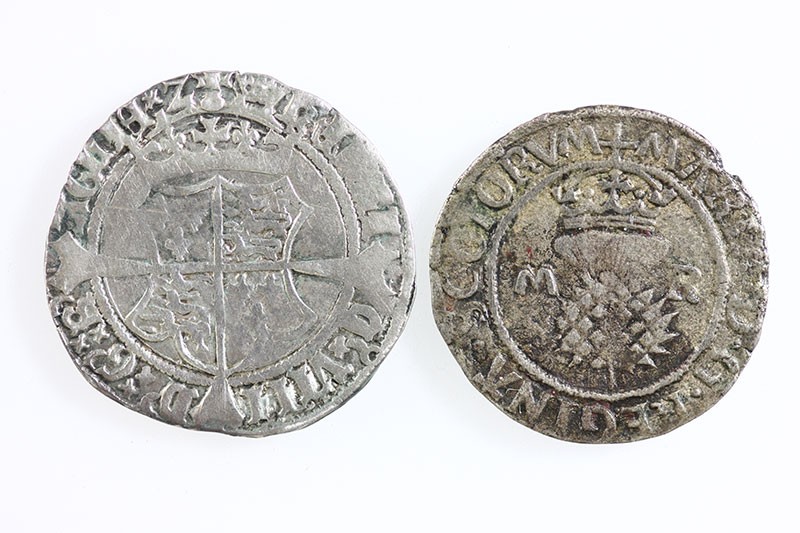 Pair of coins: Ireland. Under English domination. Henry VIII (1509-1547). First Harp issue Groat. With Jane Seymour (1536-1537). 2.33 gms. Cross over crowned Arms, rev. Crowned harp dividing crowned 'hI'. S.6473. A few old test pinscratches, a bit bright, About Very Fine; and Scotland. Mary, before marriage (1542-1558). Billon Bawbee. Edinburgh. 2.23 gms. S.5432. A bit grainy and somewhat crude, About Very Fine. (2)