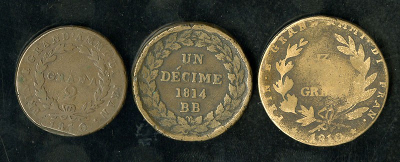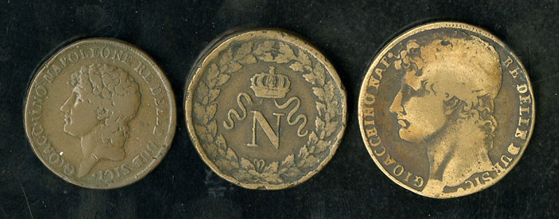 Napoleonic AE trio. Italy. Naples and Sicily. Gioacchino Napoleone (Joachim Murat, 1808-1815). 2 Grana, 1810. Bare bead left. KM 252, Natural edge clip, Good Fine; 3 Grana, 1810. Date below wreath. Cr.102a. Very Good; and France. Strasbourg Provisional Coinage. Decime, 1814 BB. KM 700. Edge has been tapped, Fine+. (3)
