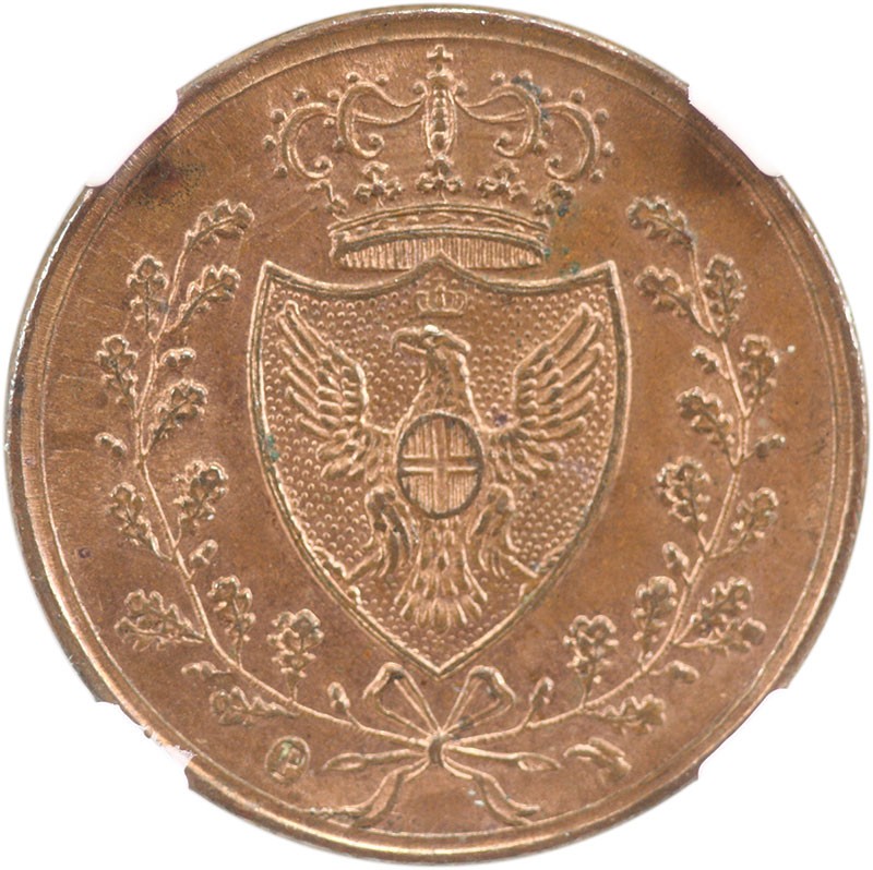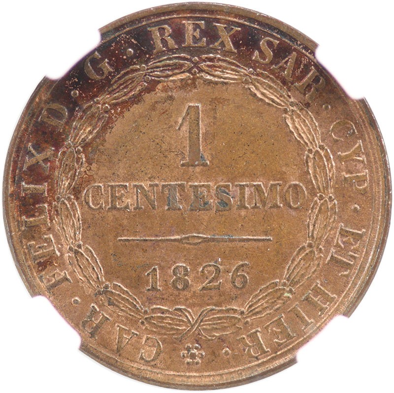 Italian States. Sardinia. Carlo Felice (1821-1831). Centesimo, 1826 P, eagle head. Cr.98.2. NGC MS 62 RB.