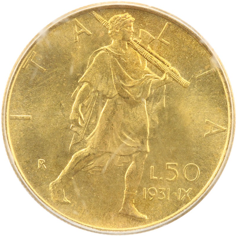 Italy. Kingdom. Vittorio Emanuele III (1900-1946). 50 Lire, 1931 R. Anno IX. Roma. Uniformed king's bust left, rev. Lictor walking right with fasces and ax over his shoulder. Fr.34, KM 71. PCGS MS 64.