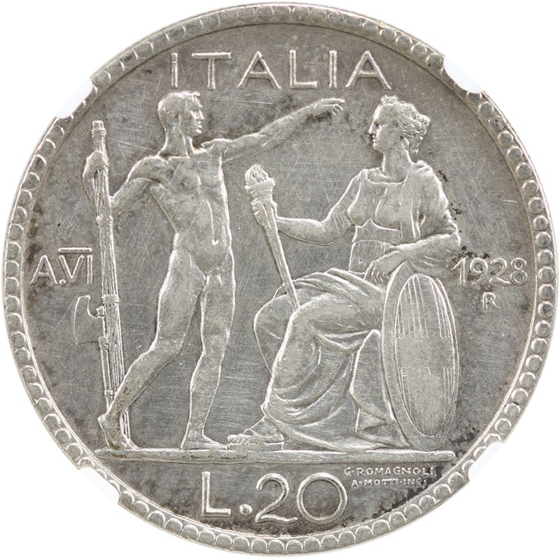 Italy. Kingdom. Vittorio Emanuele III (1900-1946). 20 Lire, 1928 R. Anno VI. Roma. Bare head right, rev. Nude male standing right, holding fasces and ax, before seated Italia. KM 69. NGC XF Details. Excessive Surface Hairlines.