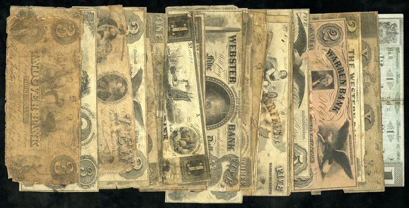 Other banks represented are Webster (Boston); Cambridge City; Tradesman's (Chelsea); Blue Hill (Dorchester); Fall River(2); Rollstone (Fitchburg); Essex (Haverhill); Union (Haverhill); Leicester; Bay State (Lawrence); Prescot (Lowell); Laighton (Lynn); Merchants (Newburyport); Newburyport; Adams (North Adams); Agricultural (Pittsfield); Pittsfield; Warren (South Danvers); Western (Springfield); Citizens (Worcester); Merchants (Worcester). Most are basically intact, but have condition problems. Must be seen. Sold as is. [35]