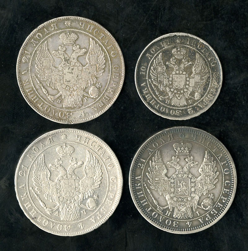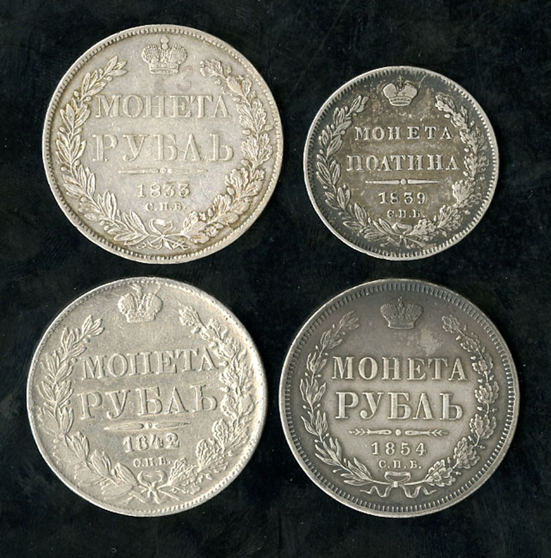 Russia. Nicholas I (1825-1855). Trio of Rubles: 1833 C??-H?, 1842 A?, 1854 HI. St. Petersburg. Imperial eagle within braided circle, rev. Two-line legend within wreath, date and mint initials below, crown above. Cr.168.1. The first with faint remnant of old ink number on reverse, contact marks and small edge lamination on obverse, Very Fine-Extremely Fine; also Poltina, 1839 H?. Minor edge tamping, About Very Fine. (4)