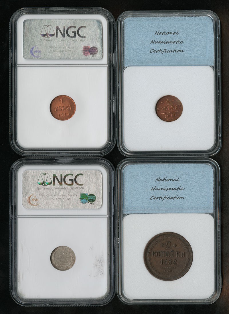 Russia. Quartet of encapsulated coins: Silver 5 Kopeks, 1884 A?. NGC AU 58; Finland. Russian Grand Duchy. Penni, 1913. NGC MS 66 RD; Russia. 2 Kopeks, 1852 EM. About Extremely Fine, graded by NNC AU-50; ½ Kopek, 1910, artificially toned AU, graded by NNC MS-64 Red. (4)