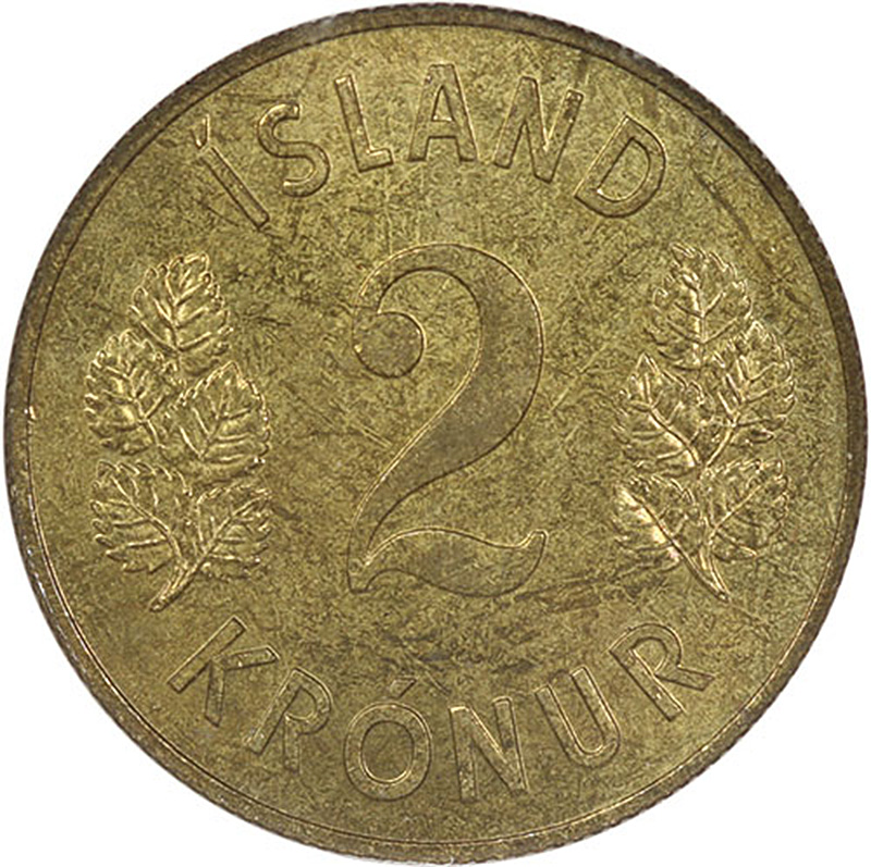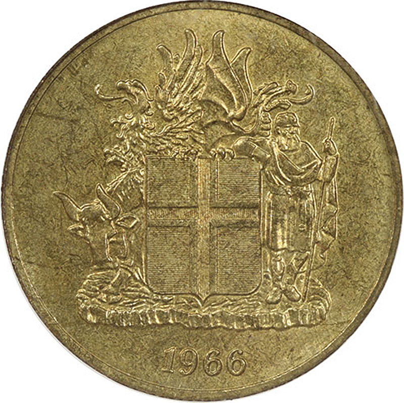 Iceland. Republic. 2 Krónur, 1966. Thick Planchet. Icelandic Arms supported by a bull, rock giant, sea-eagle/griffin and dragon, rev. Value. KM 13a.2. Very rare with a mintage of only 300 pieces. NGC MS 64.