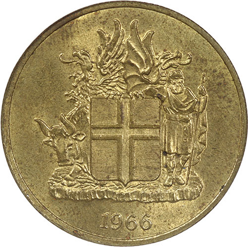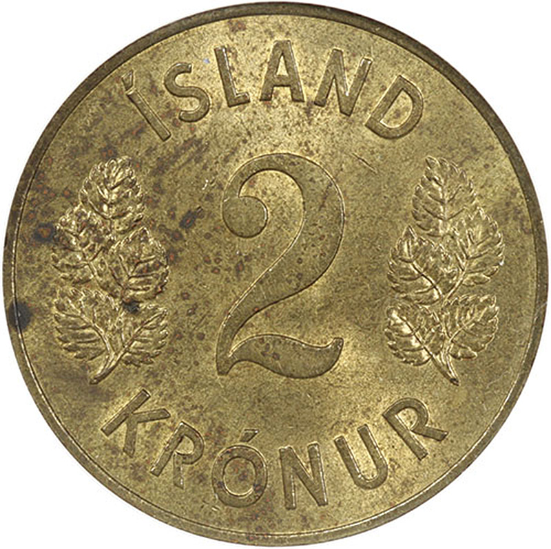 Iceland. Republic. 2 Krónur, 1966. Thick Planchet. Icelandic Arms supported by a bull, rock giant, sea-eagle/griffin and dragon, rev. Value. KM 13a.2. Very rare with a mintage of only 300 pieces. Some spotting on reverse. NGC MS 62.