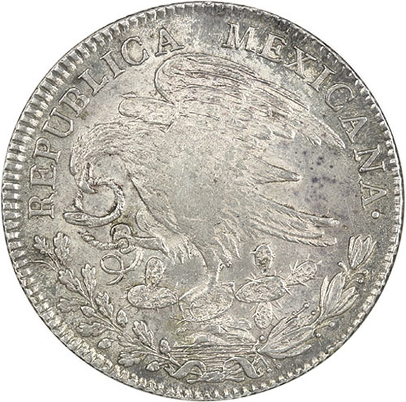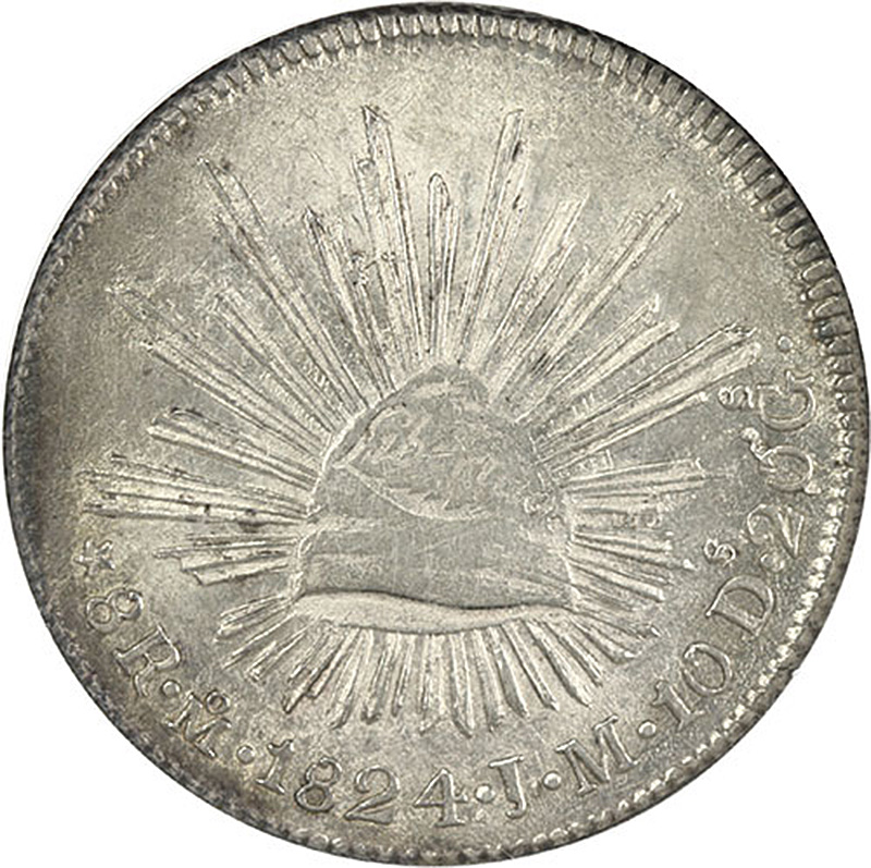 Mexico. Republica. 'Hook-Necked' 8 Reales, 1824 Mo JM. Mexico City. Hooknecked (profile) eagle left, holding looped snake in its beak, standing atop cactus, spray below, rev. Cap and rays. KM A376.2, Eliz. 180. Lightly toned, good lustre. NGC MS 62. Rare in this grade.