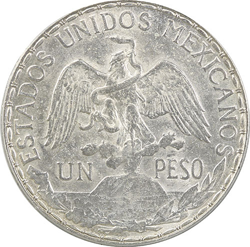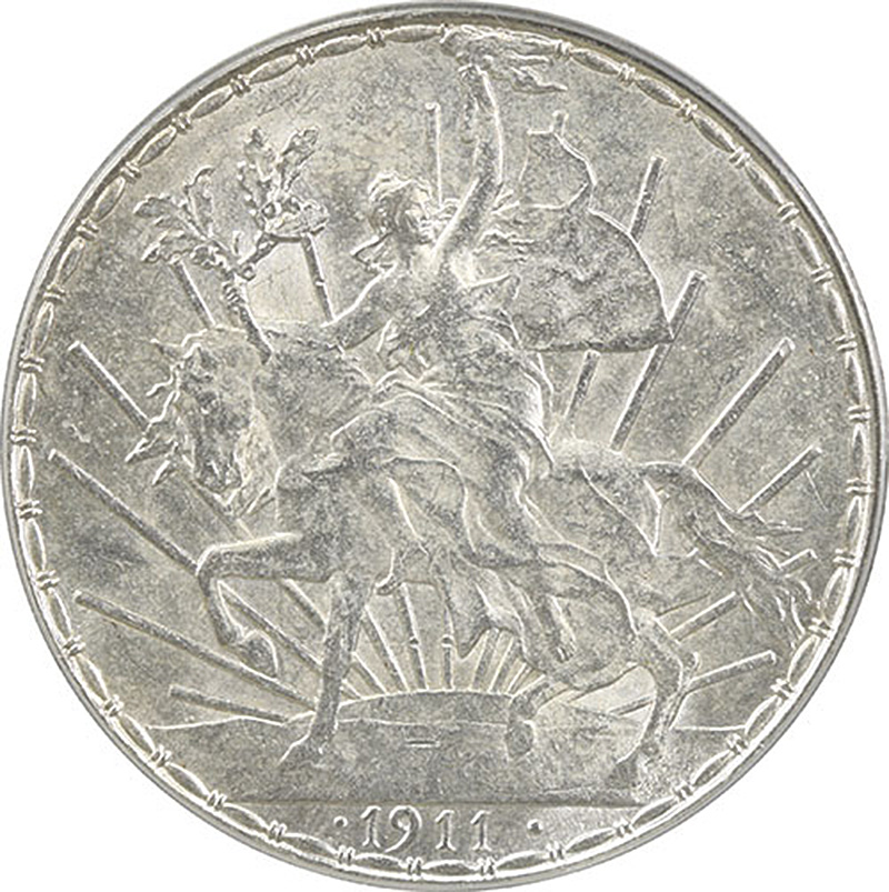 Mexico. Estados Unidos. Peso, 1911. Short Ray. Caballito. National Arms, rev. Woman, holding torch aloft and branch, riding horse left, sun in background, short lower left ray. KM 453. Very scarce variety. PCGS MS 62;