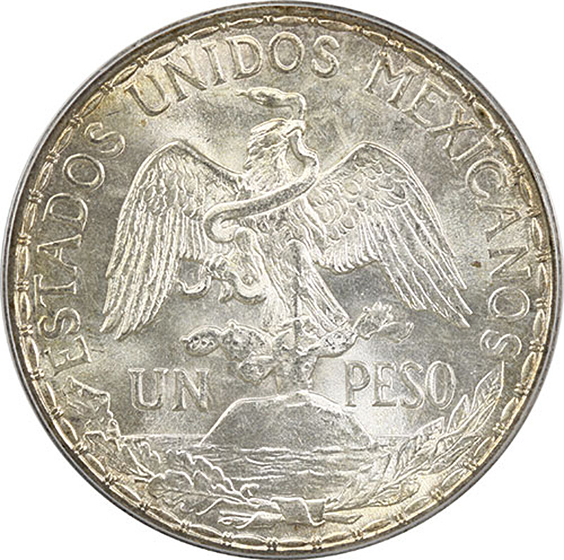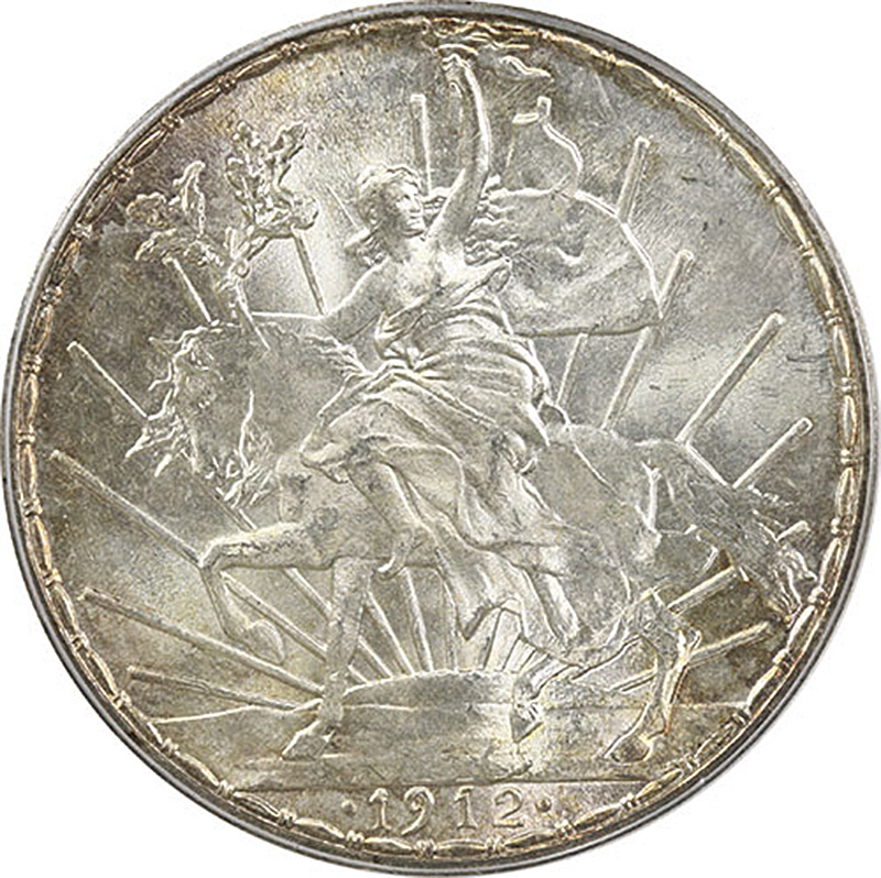 Mexico. Estados Unidos. Peso, 1912. Caballito. National Arms, rev. Woman, holding torch aloft and branch, riding horse left, sun in background. KM 453. Semi-key date. Peripheral russet hues, bold lustre and sharp details. PCGS MS 66.