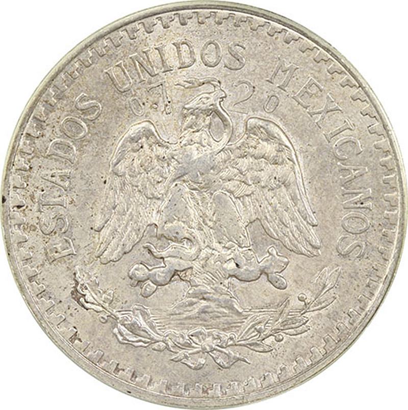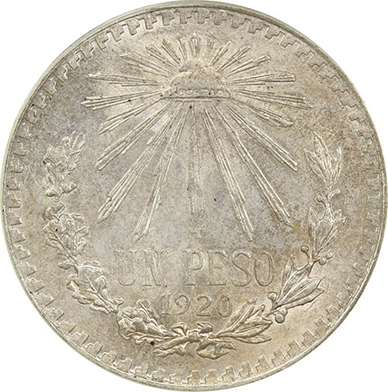 Mexico. Estados Unidos. Peso, 1920 M. Eagle on cactus, snake in beak, '0.720' flanking eagle's headrev. Cap and rays above value and date above spray. KM 455. Lightly toned. PCGS MS 64.
