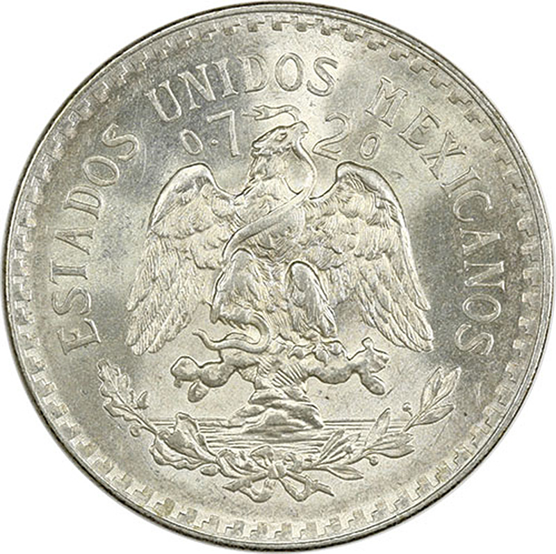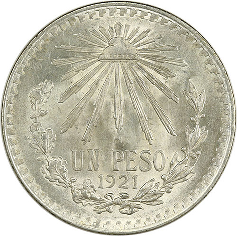 Mexico. Estados Unidos. Peso, 1921 M. Eagle on cactus, snake in beak, '0.720' flanking eagle's headrev. Cap and rays above value and date above spray. KM 455. Brilliant Uncirculated.