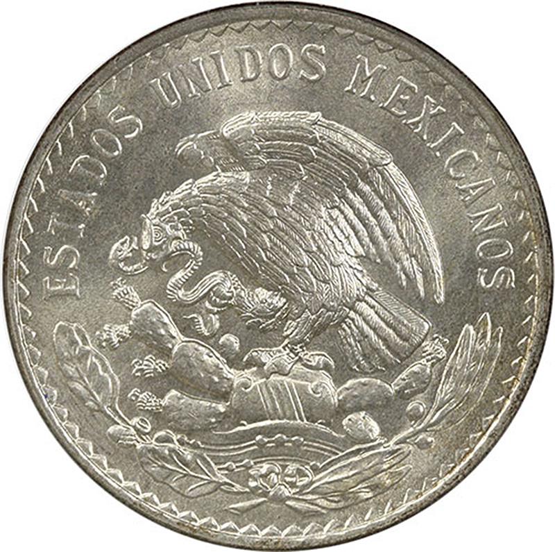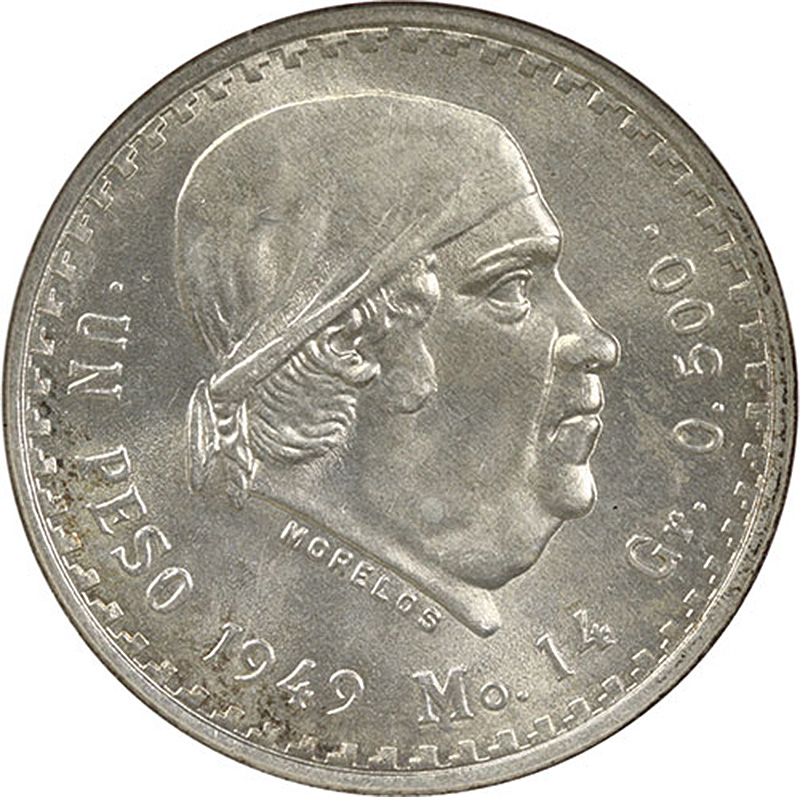 Mexico. Estados Unidos. Peso, 1949 Mo. Mexico City. Head of Morelos right wearing his tight-bound headcloth, rev. National Arms. KM 456. Not released for circulation, Very Rare. Pale peripheral amber hues, lustrous. NGC MS 64.