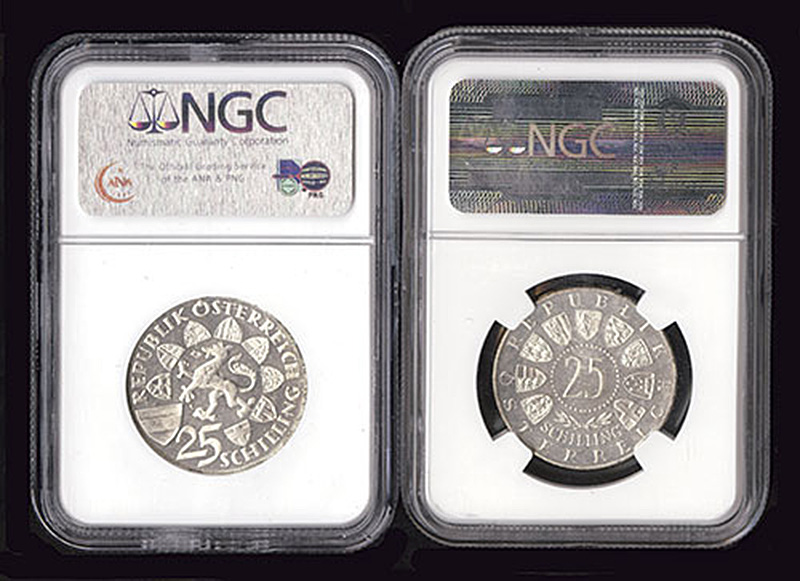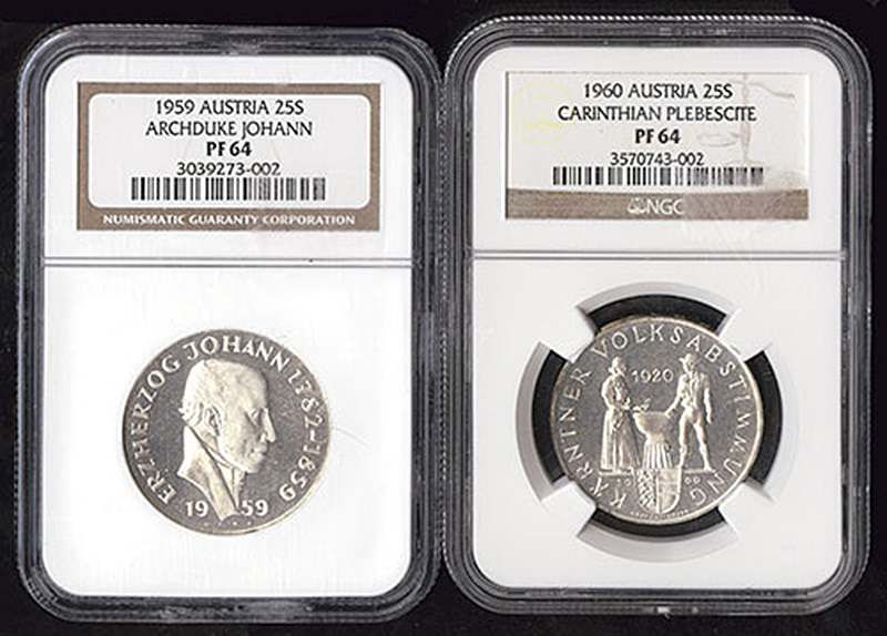 Austria. Republik. Proof 25 Schilling Commemorative Pair: 1959 - Centennial of the Death of Archduke Johann; 1960 -- 40th Anniversary of the Carinthian Plebescite. KM 2887, 2890. Both NGC PF 64. (2)