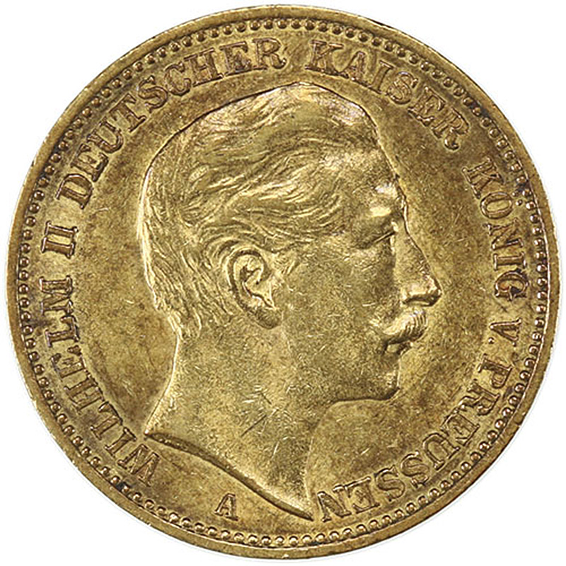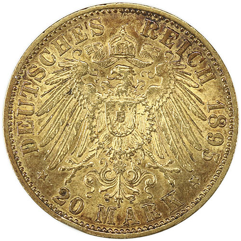 German States. Prussia. Wilhelm II (1888-1918). 20 Mark, 1895 A. Head r., rev. Type III - broad Imperial eagle. KM 521. Toned Extremely Fine.
